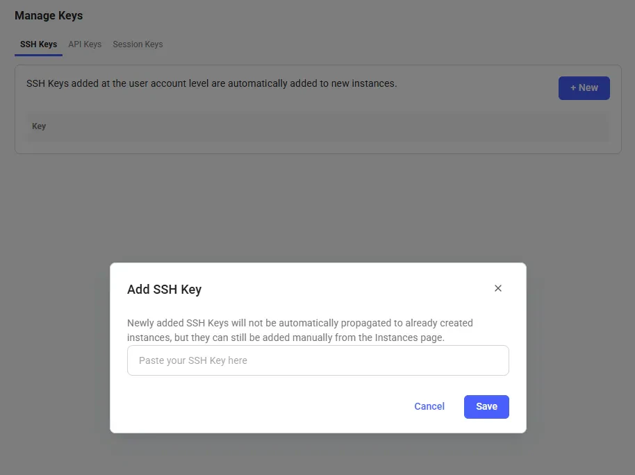• Existing instances will not get the new key automatically. To add a key, use the instance-specific SSH interface.